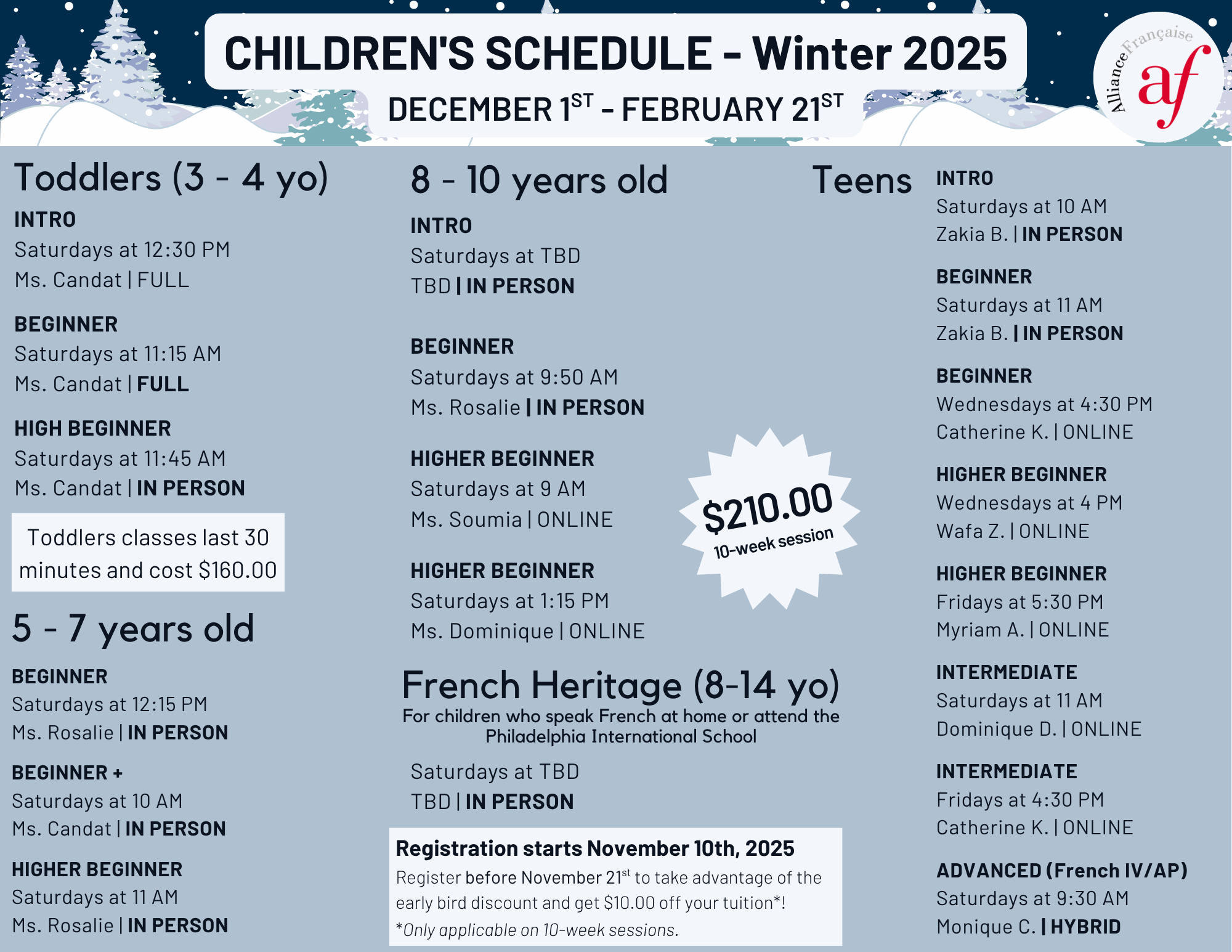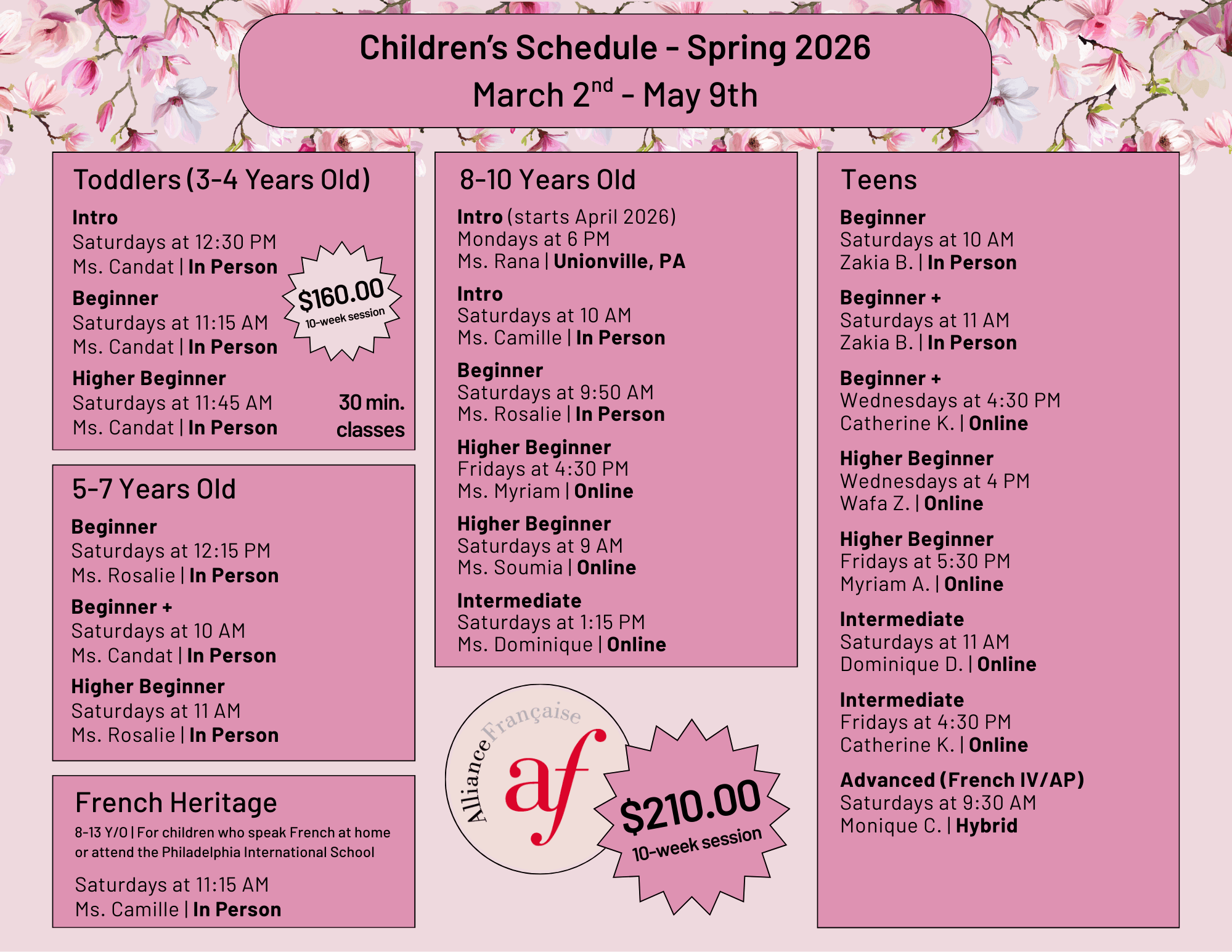 The Alliance Française de Philadelphie reserves the right to cancel classes and change teachers if necessary. Courses are typically cancelled due to insufficient enrollment.