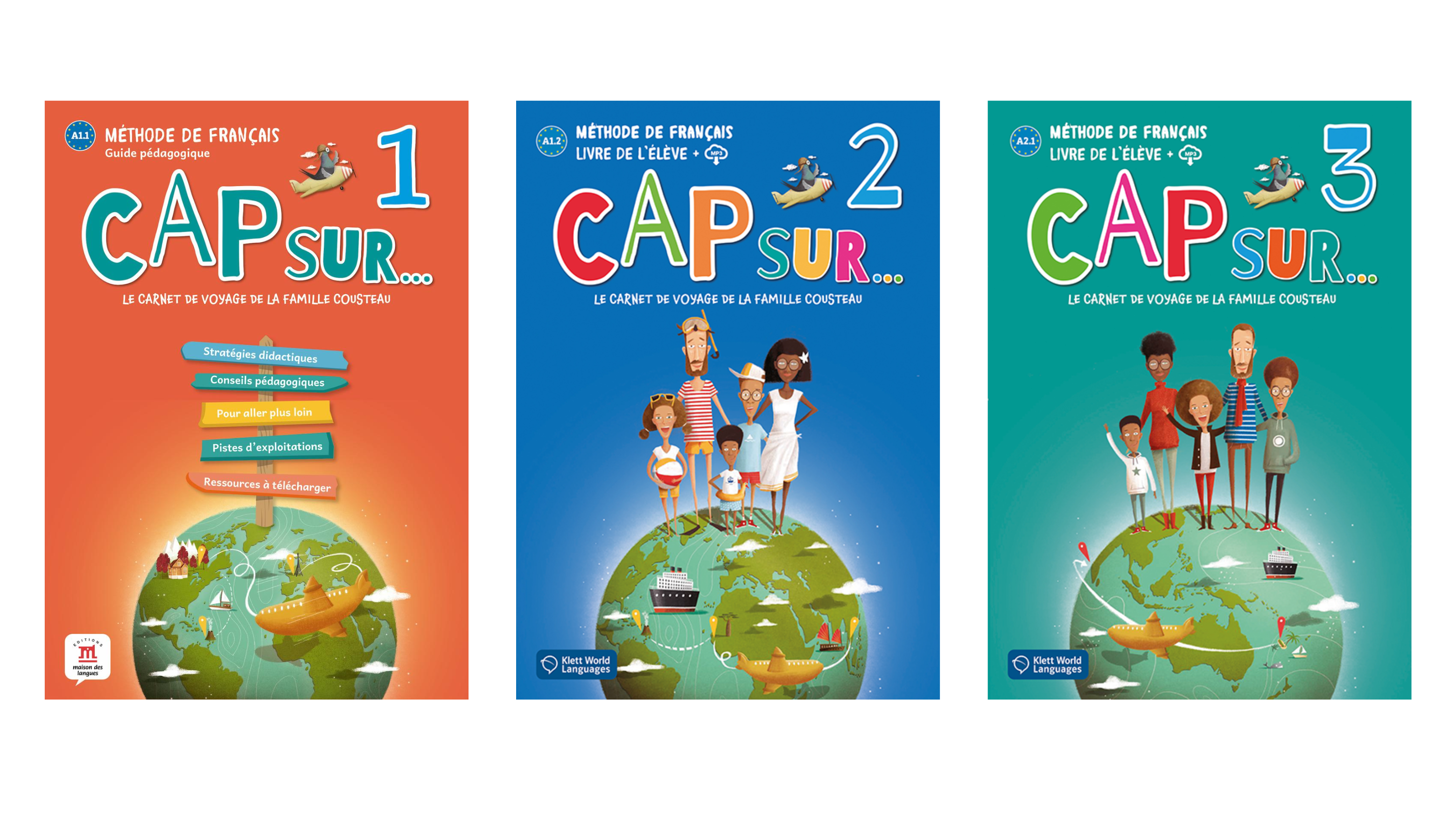 Cap sur is a collection of French textbook designed for children ages 8–10. It follows the adventures of the Cousteau family as they travel around the Francophone world—from Paris to Martinique, Senegal, Canada, and beyond. Along the way, they document their journey in an illustrated travel journal, which serves as a central element of the learning experience.