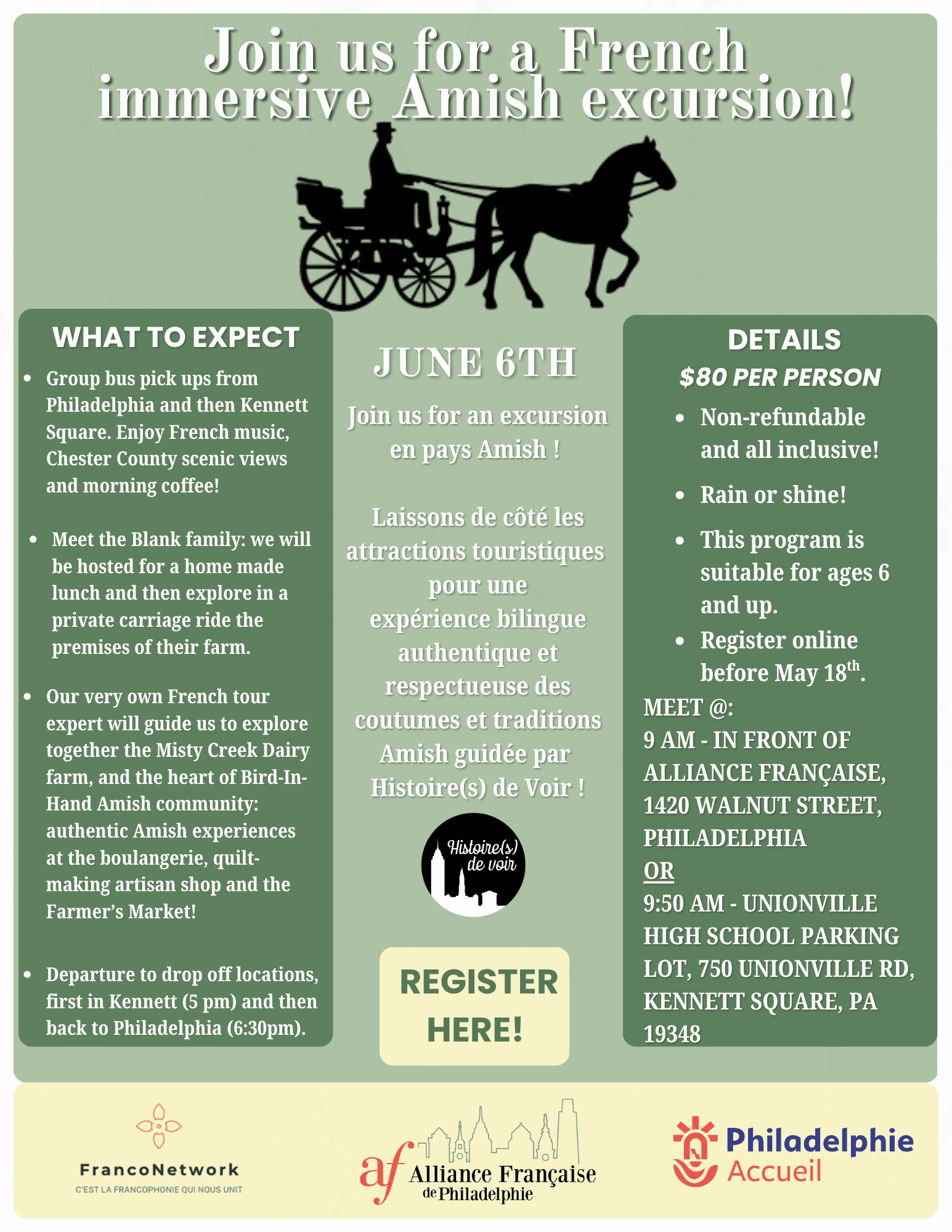 -Group bus pick ups from Philadelphia and then Kennett Square. Enjoy French music, Chester County scenic views and morning coffee!