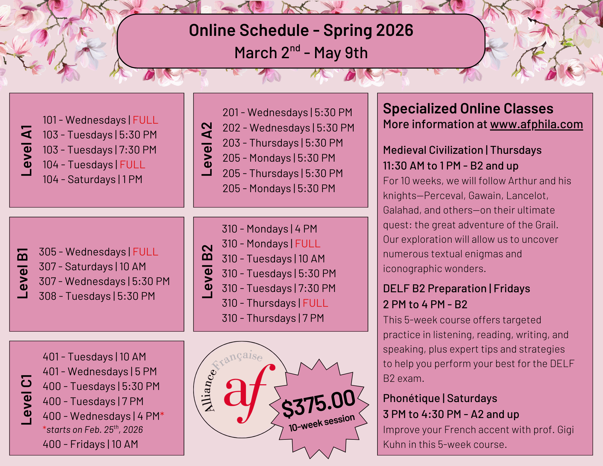 At Alliance Française de Philadelphie, we offer French classes all year round! Four 10-week sessions for each season (Fall, Winter, Spring & Summer). Classes are offered online or in person, in center city Philadelphia at different levels, from A1 to C1. Additionally to general French classes, we regularly offer of variety of specialized classes, from literature and civilization to more cultural workshops. Il y en a pour tous les goûts !