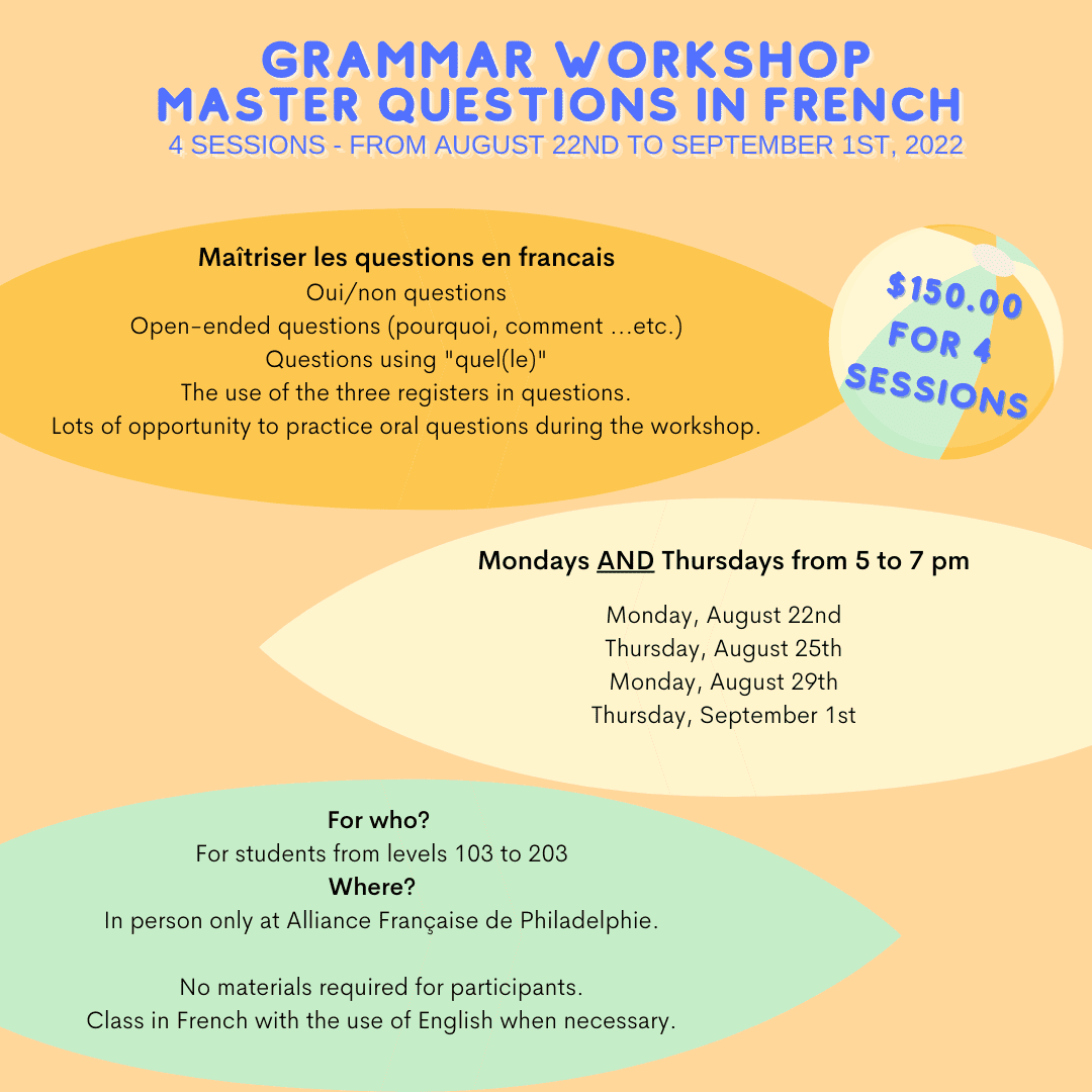 This workshop is catered to students of level A1 to A2. If you are unsure of your level, contact Alissia at alliance@afphila.com.